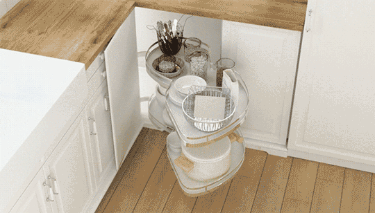 L型和U型櫥柜的轉(zhuǎn)角處很容易浪費(fèi),裝旋轉(zhuǎn)拉籃或轉(zhuǎn)角抽屜可以完美解決。