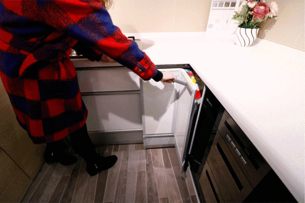 靠近操作臺(tái)的地方可以做一個(gè)翻轉(zhuǎn)抽屜,收納清洗物品。