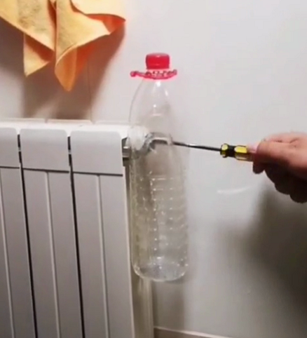 3.暖氣片放氣操作:將礦泉水瓶有較大的缺口一側(cè),套在并安放在放氣閥上。用螺絲刀從較小的洞口穿過,逆時針擰動放氣閥。松動時,可以聽見有氣體聲音放出,同時伴有暖氣水流出。