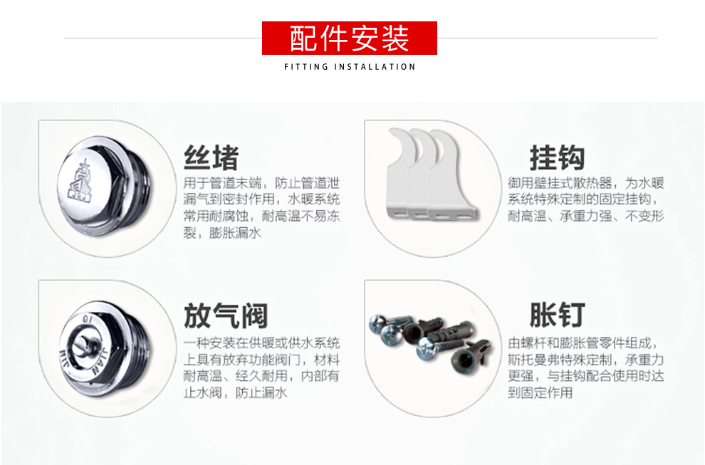 3、脹釘和掛鉤。它們是將暖氣片固定在墻面上的好幫手,在如今越來(lái)越追求美觀的情況下,消費(fèi)者更習(xí)慣將暖氣片掛在墻面上,這就要求脹釘和掛鉤具有很強(qiáng)的抗壓、抗拉性能,保證暖氣片不會(huì)移動(dòng),安全的工作。