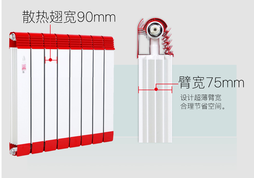 金旗艦成功自主研制出國內(nèi)第一款集“環(huán)保、安全、防熏墻”三重功效于一體的產(chǎn)品——“防熏墻”系列銅鋁復(fù)合散熱器,該散熱器增加防熏墻扣帽設(shè)計(jì),獨(dú)特的防熏墻原理設(shè)計(jì),大大有效的杜絕墻面的熏黃與熏黑,對墻面的保護(hù)近乎完美,是品味一族的不二之選。同時它擁有大水道,大翅片,大散熱量,穩(wěn)重典雅的設(shè)計(jì),通過千萬道工序的審核。