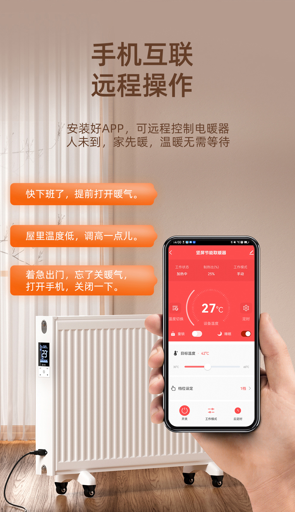 定時開關(guān):利用APP的定時功能,用戶可以預設(shè)電暖器的開關(guān)時間,實現(xiàn)自動化管理。例如,在每日工作前設(shè)置啟動時間,到家前開啟暖氣,以保證舒適的室溫。